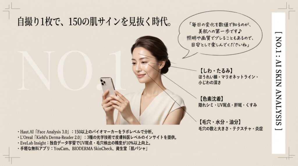 2025年に発表されたHaut.AI「Face Analysis 3.0」は、自撮り写真たった1枚から150以上のバイオマーカーと29のパラメータをラボレベルの精度で分析できます(参考: Cosmetics Design Europe)。